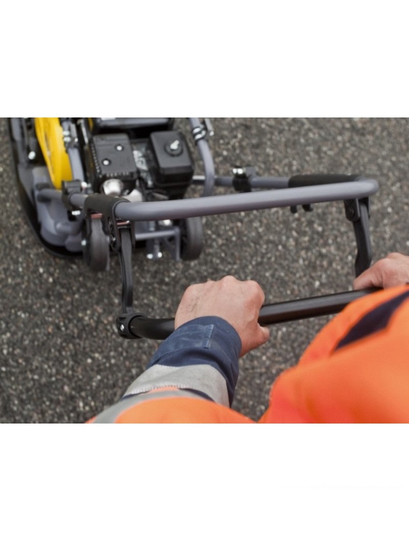 Плита оснащена системой распределения воды, которая предотвращает налипание асфальта и дает чистую поверхность при работе по горячему материалу. Бак объемом 13 литров обеспечивает длительную работу без дозаправки. Подъемная проушина и транспортные колеса делают перемещение между объектами быстрым и удобным.