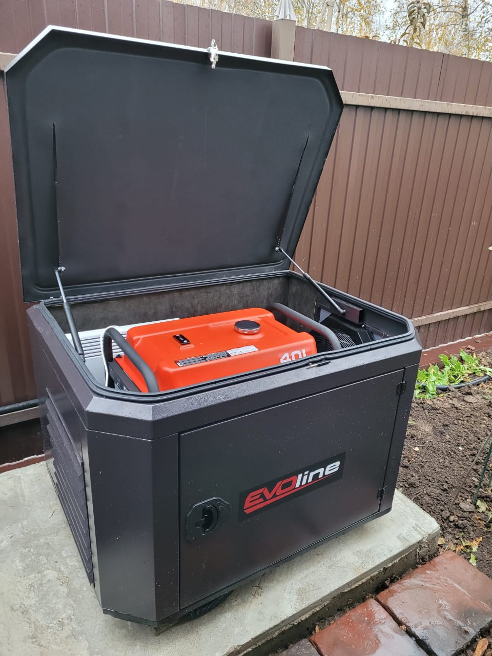 Теперь владелец дома может не волноваться об отключениях света — бензиновая электростанция в шумозащитном кожухе обеспечивает стабильное питание даже при авариях в электросети.